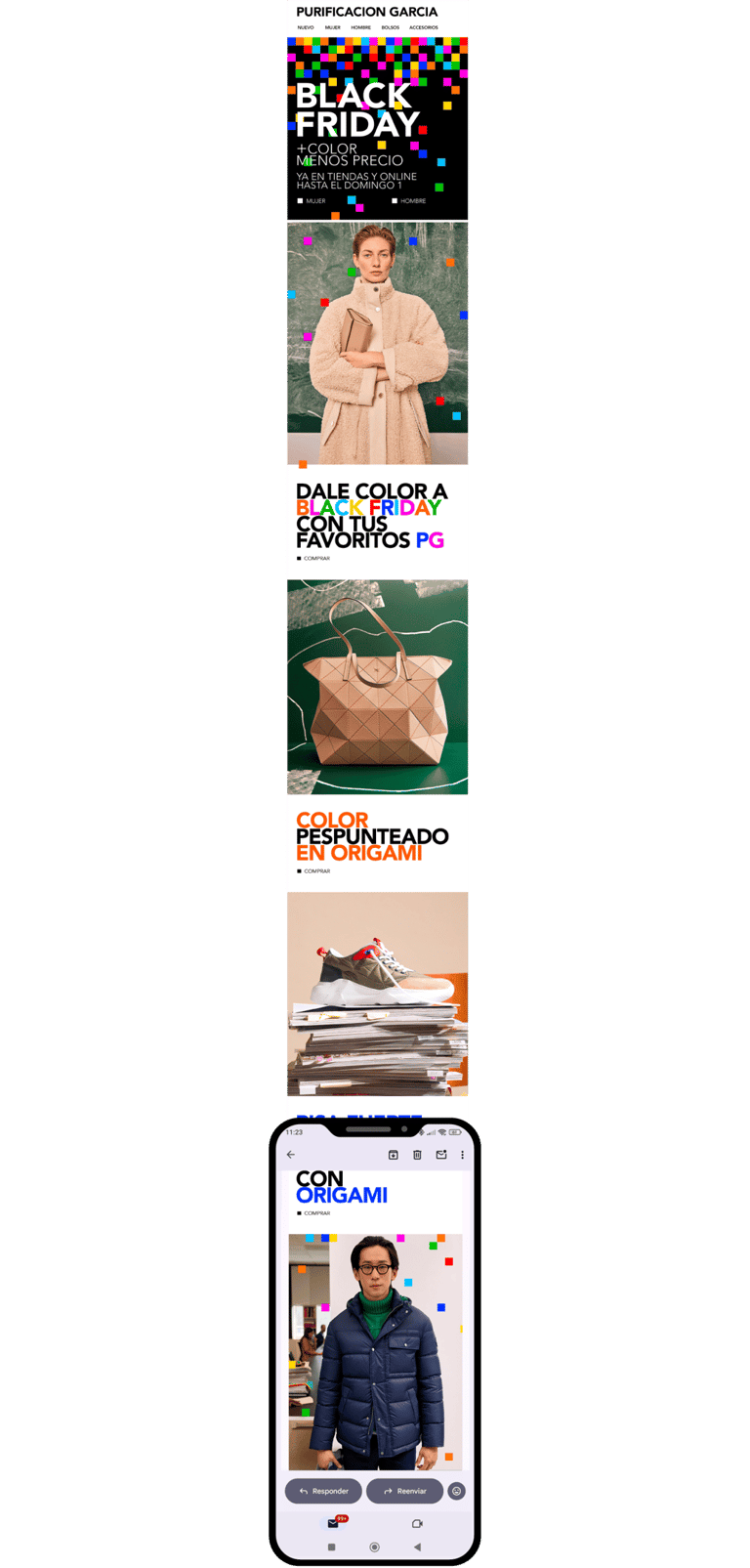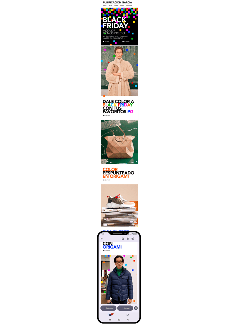 Black Friday reinterpretado desde el universo visual de Purificación García. La campaña parte del cubo como símbolo clave de la marca, transformado en una retícula de “píxeles” de color que invade todos los canales. Geometría, color primario y ritmo visual para traducir el descuento en impacto gráfico, sin perder identidad.