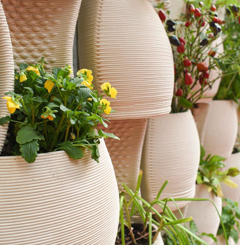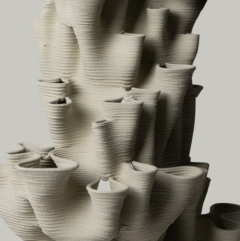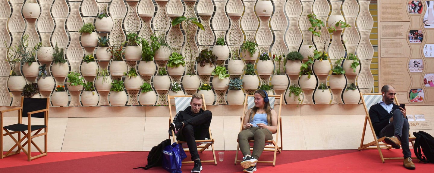 Fotografías promocionais da exhibición final dun muro cerámico impreso en 3D, deseñado para aloxar aves e plantas. Capturadas intencionadamente con persoas interactuando, estas imaxes amosan a vitalidade do proxecto e a súa conexión co concepto de arquitectura do benestar para un futuro sostible.