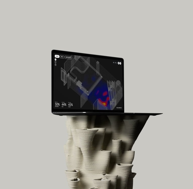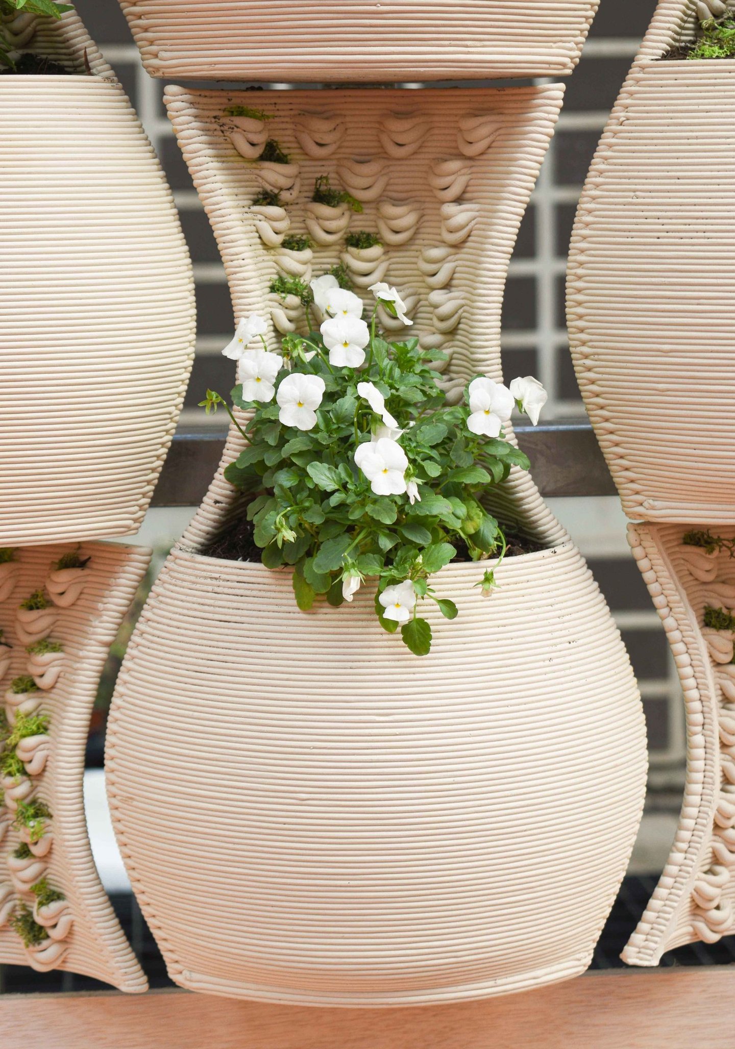 Fotografías promocionais da exhibición final dun muro cerámico impreso en 3D, deseñado para aloxar aves e plantas. Capturadas intencionadamente con persoas interactuando, estas imaxes amosan a vitalidade do proxecto e a súa conexión co concepto de arquitectura do benestar para un futuro sostible.