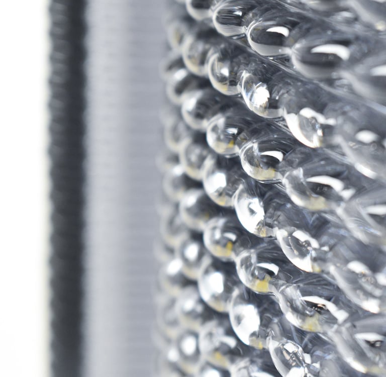 Sesión fotográfica de esculturas deseñadas para albergar algas para a produción de enerxía renovable. As sombras utilizáronse estratexicamente para realzar os patróns e a luminosidade das pezas. A disposición das esculturas nesta colección insinúa sutilmente o sistema de fabricación modular do proxecto, o que é beneficioso para os obxectivos de marketing.